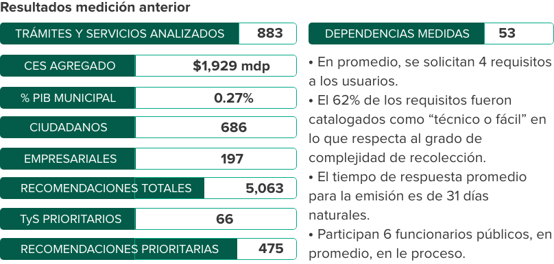Permite detectar las dependencias gubernamentales con mayor costo social, así como los trámites y servicios con mayor costo dentro de las mismas, y así, generar recomendaciones de simplificación específicas.
